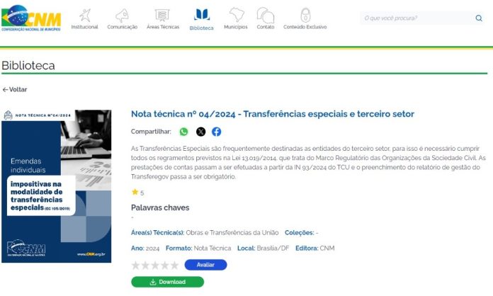 Com o escopo de orientar os gestores municipais sobre a utilização de recursos das transferências especiais, mais conhecidas como emendas PIX, a Confederação Nacional de Municípios (CNM) elaborou a Nota Técnica 4/2024. O texto, de autoria da área de Obras e Transferências da União, está disponível para download na Biblioteca Digital da entidade.