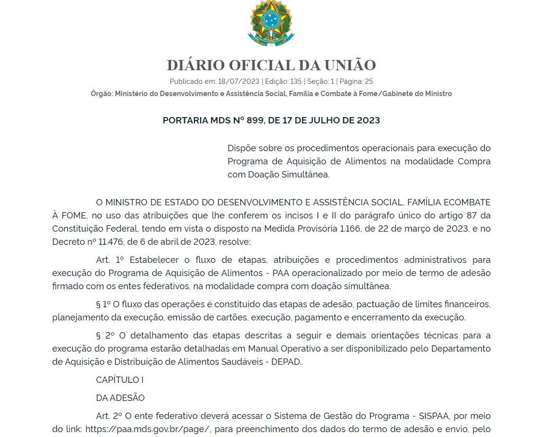 Publicação do Diário Oficial da União (DOU) estabelece os fluxos, etapas e procedimentos administrativos para execução do Programa de Aquisição de Alimentos (PAA) na modalidade compra com doação simultânea. A Portaria 899/2023, divulgada no dia 18 de julho, traz orientações aos Entes federativos, inclusive os Municípios, sobre como proceder para aderirem ao programa através do Sistema de Gestão do Programa (SISPAA).